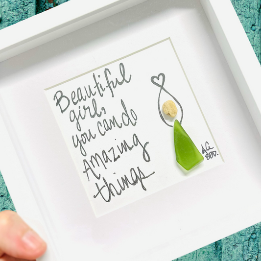 This 6x6 inch framed sea glass art from Back Bay Designs blends natural beach treasures with modern whimsy, creating a unique, peaceful touch for your decor.