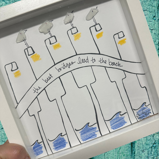 Bridge to the Beach - Coastal Sea Glass Art, Beach House Decor, 8x8 Framed