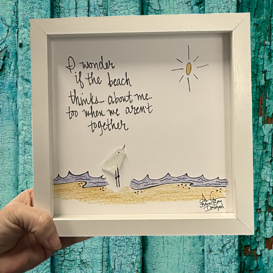 Wonder If The Beach Thinks About Me Too (with color) - Sea Glass Art, Coastal Vacation Nostalgia, 8x8 framed