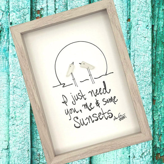 You Me And Sunsets - SLIM Sea Glass Art, 5x7 Whitewash Frame