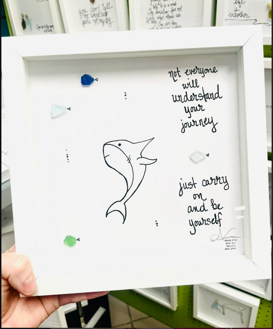 Shark Be Yourself - Sea Glass Art, Uplifting Encouragement Gift, Sea Life Decor, 8x8 framed