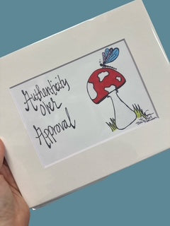 Boldly showcase your true self with this striking 8 x 10 inch print featuring a red and white mushroom crowned by a winged dragonfly. Emblazoned with the powerful message "Authenticity over Approval," this piece challenges convention while elevating any minimalist white décor. An ideal gift for birthdays, graduations, or garden enthusiasts, it's an original design from NJ’s daring, mama-owned Back Bay Designs, crafting unique art since 2013.