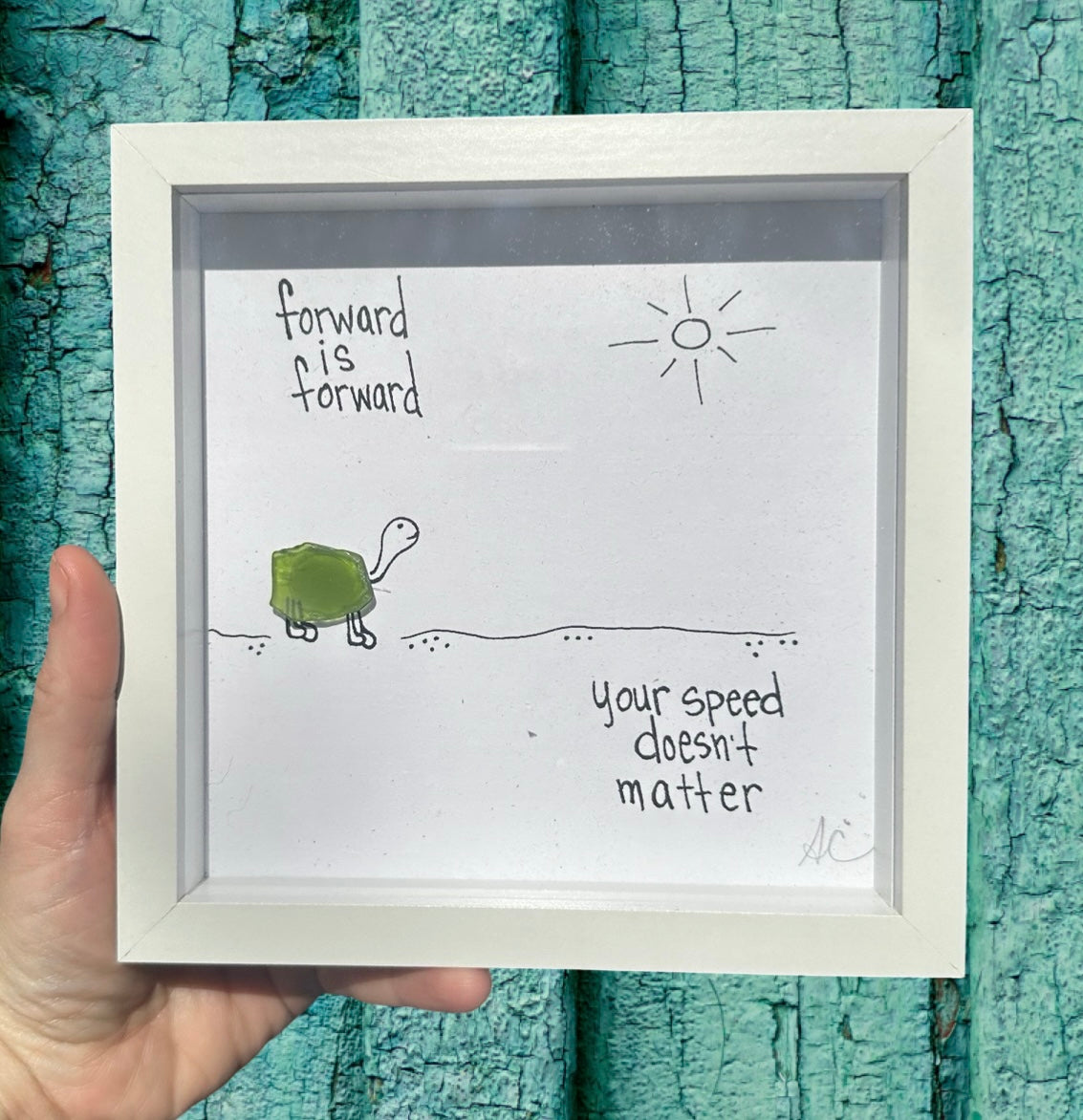 The Forward Turtle MINI features a sea glass turtle shell and inspires mindfulness with the quote, "Forward is forward. Your speed doesn't matter." Perfect gift for meditation and nature lovers.