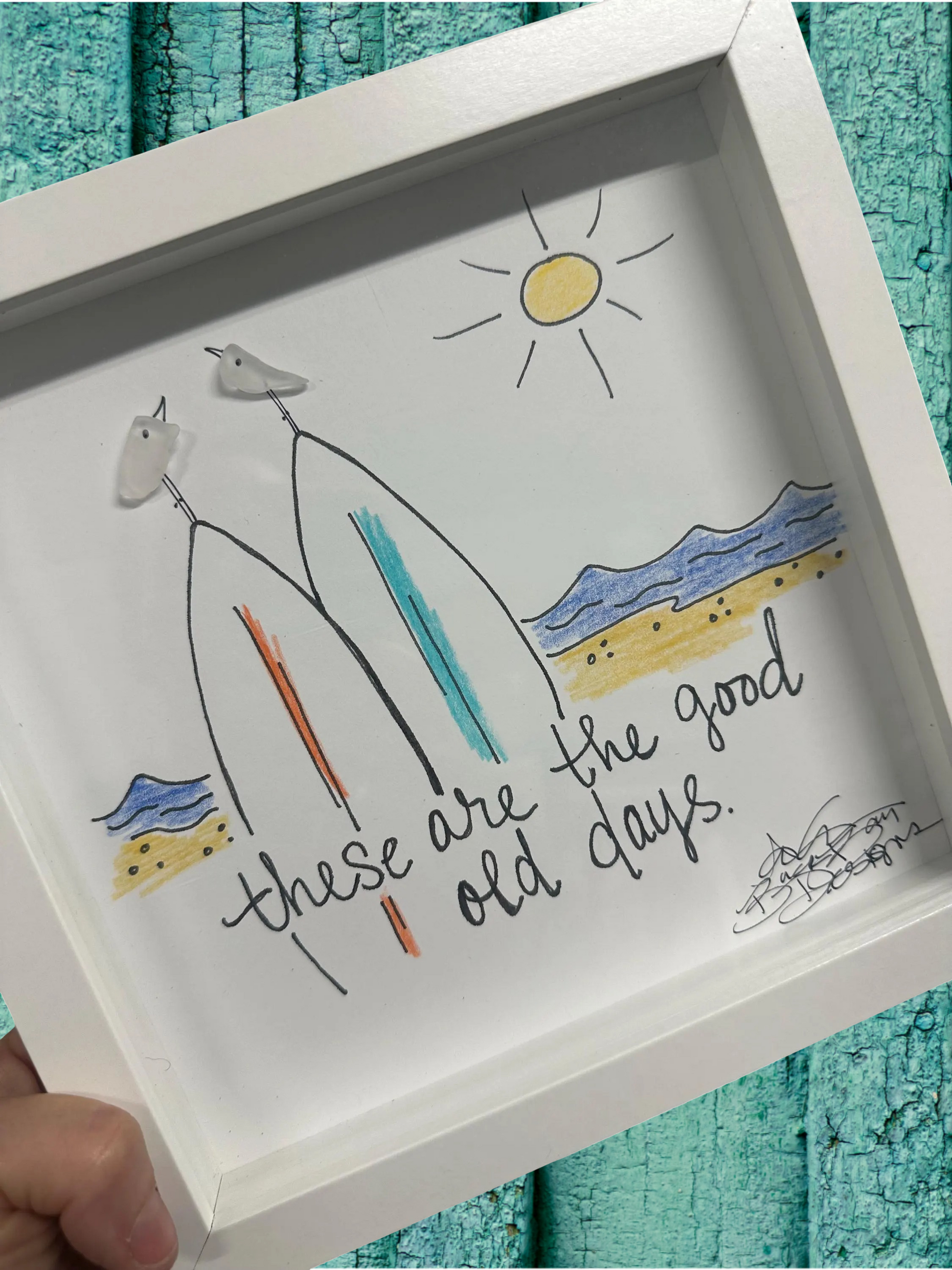 Good Old Days - Sea Glass Art, Surfboards Beach Meditation, Mindful Coastal Decor